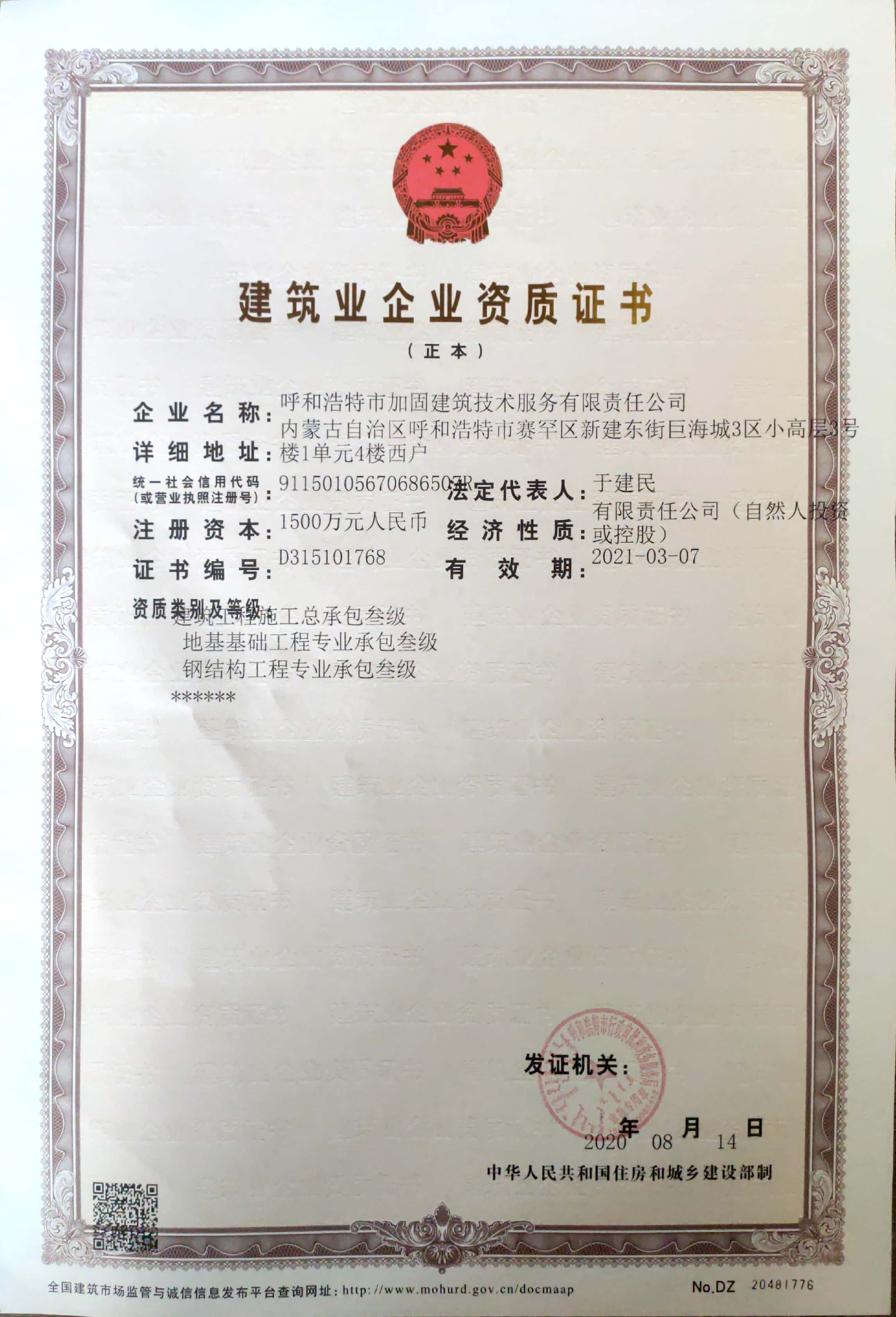 熱烈慶祝我公司新增建筑總承包叁級資質。這是公司在施工資質上的一項重大突破,對于公司轉型升級、拓寬經營領域,提升企業競爭力具有重要意義。至此,公司擁有建筑總承包叁級、特種工程(結構補強)專業不分等級、地基基礎工程專業承包叁級、鋼結構工程專業承包叁級,四個施工資質,涉足四個行業方向。固之堅,譽可信。歡迎各界人士及新老客戶來我公司參觀考察、洽談業務,期待著與您的交流合作。